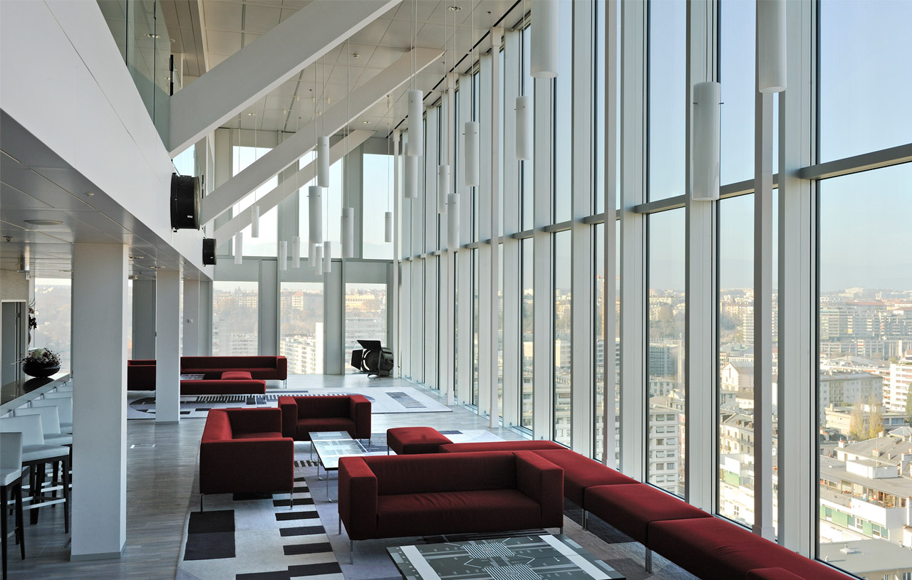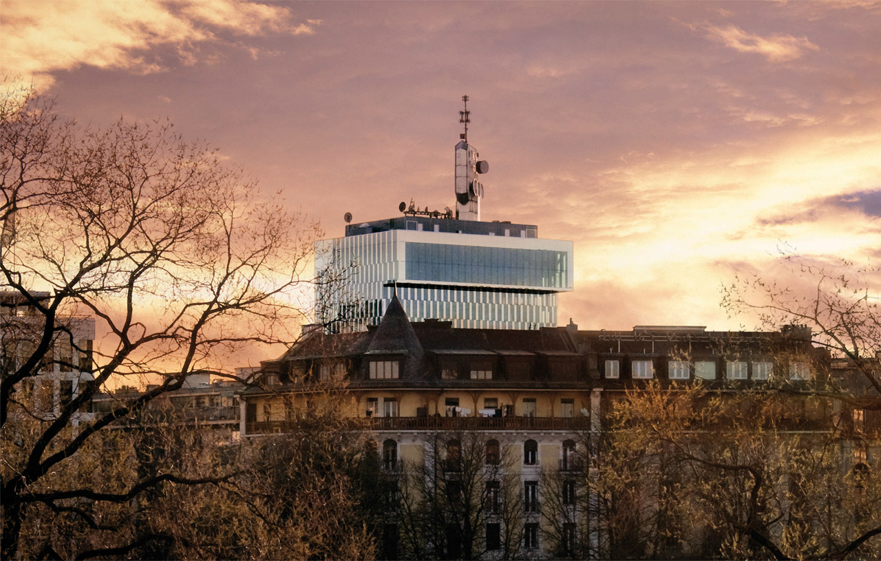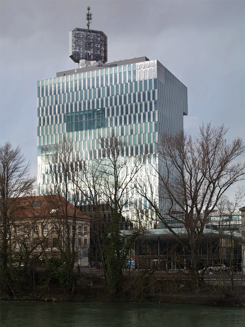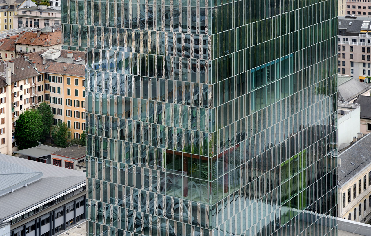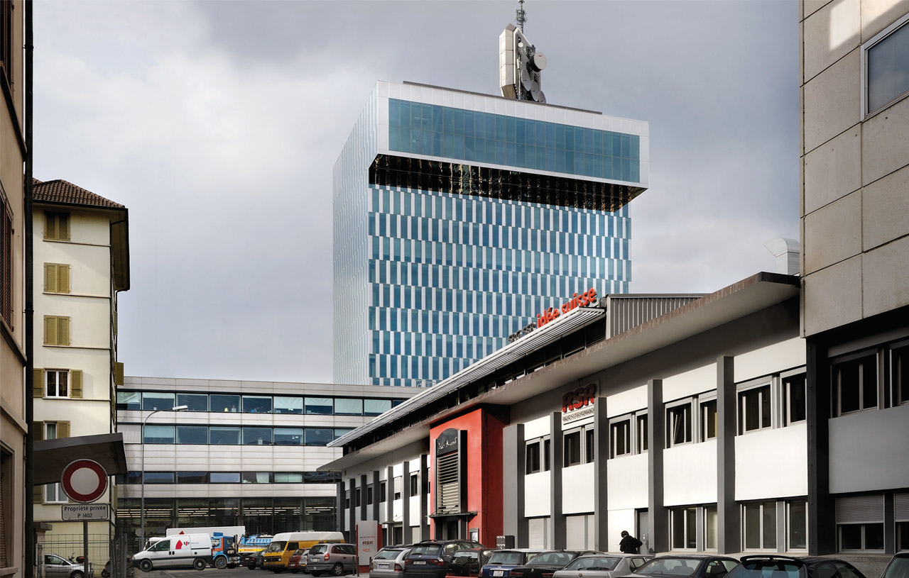 L’ancienne tour érigée par Arthur Bugna en 1973 était frappée d’obsolescence. Le projet pour la nouvelle tour a consisté en une mise à nu de l’ossature béton et à une redéfinition complète de son architecture. Il s’est agi de concevoir une organisation spatiale et une image contemporaine qui répondent au changement de culture de l’entreprise de service public qu’est la Radio Télévision Suisse (RTS). Les aménagements des espaces de travail des 800 collaborateurs sont réorganisés sur de larges plateaux parfois ouverts sur des espaces sur double ou triple hauteur. Ces atriums permettent la rencontre informelle d’équipes tout comme l’enregistrement d’émissions. Ouverts sur l’Arve et le quartier des Vernets, ils se transforment, le soir en vitrine d’une activité toujours palpitante et à l’écoute du monde. Du côté ville et paysage lémanique, c’est un espace en porte à faux, au sommet de la tour qui couronne l’édifice. Dévolu aux réunions plus importantes et parfois festives, la grande fenêtre qui le caractérise donne sur le panorama et le met en toile de fond des enregistrements d’interviews réalisés en prime time. Enfin, la façade est composée sur une trame de 155cm dont le rythme géométrique se joue d’une pixellisation et d’effets optiques particuliers. Le volume de la tour avec ses panneaux de verre et d’acier poli miroir reflète son environnement et le climat qui l’entoure, les nuages, la pluie, le bleu du ciel. Une image toujours changeante pour une tour emblématique dans le skyline genevois.