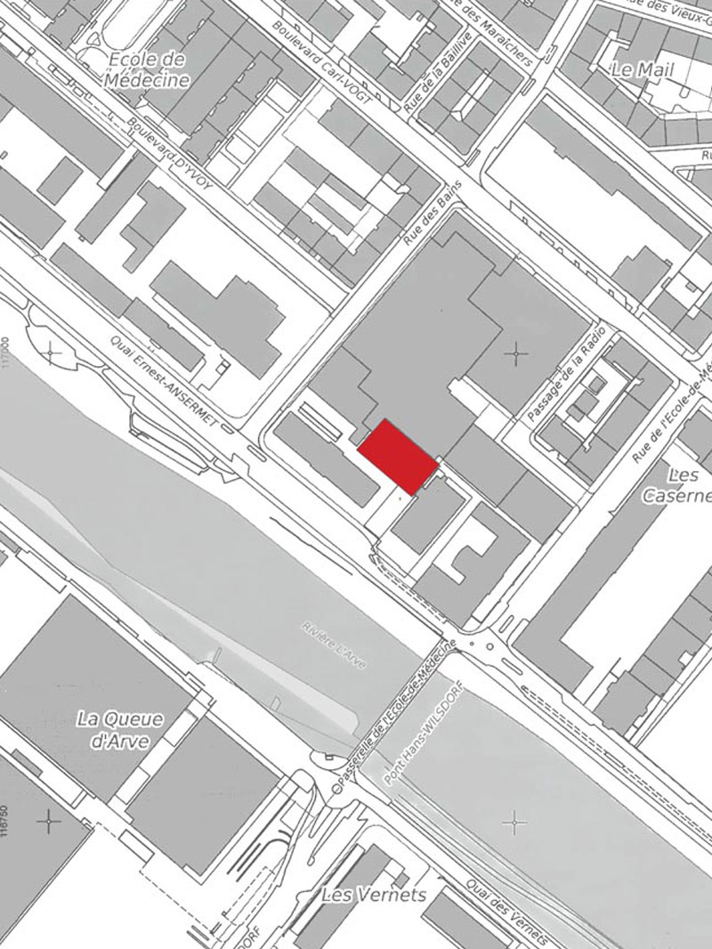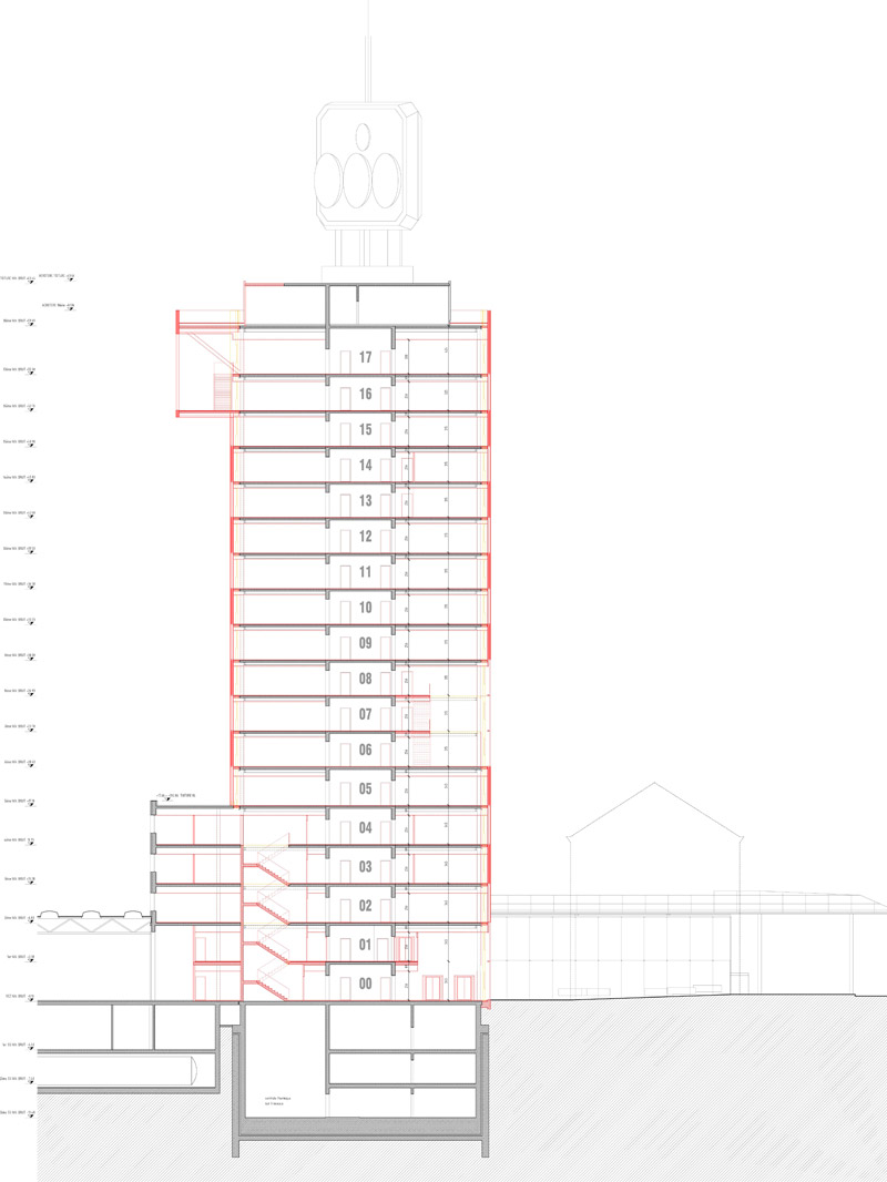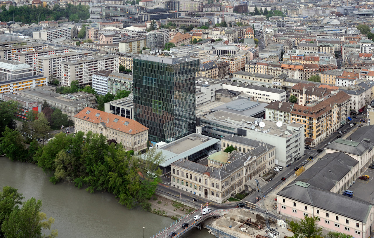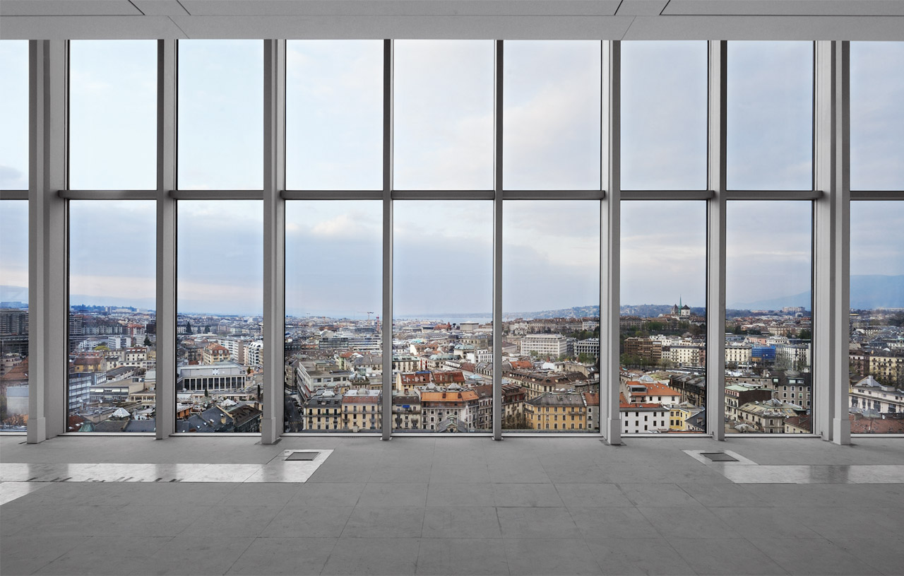 L’ancienne tour érigée par Arthur Bugna en 1973 était frappée d’obsolescence. Le projet pour la nouvelle tour a consisté en une mise à nu de l’ossature béton et à une redéfinition complète de son architecture. Il s’est agi de concevoir une organisation spatiale et une image contemporaine qui répondent au changement de culture de l’entreprise de service public qu’est la Radio Télévision Suisse (RTS). Les aménagements des espaces de travail des 800 collaborateurs sont réorganisés sur de larges plateaux parfois ouverts sur des espaces sur double ou triple hauteur. Ces atriums permettent la rencontre informelle d’équipes tout comme l’enregistrement d’émissions. Ouverts sur l’Arve et le quartier des Vernets, ils se transforment, le soir en vitrine d’une activité toujours palpitante et à l’écoute du monde. Du côté ville et paysage lémanique, c’est un espace en porte à faux, au sommet de la tour qui couronne l’édifice. Dévolu aux réunions plus importantes et parfois festives, la grande fenêtre qui le caractérise donne sur le panorama et le met en toile de fond des enregistrements d’interviews réalisés en prime time. Enfin, la façade est composée sur une trame de 155cm dont le rythme géométrique se joue d’une pixellisation et d’effets optiques particuliers. Le volume de la tour avec ses panneaux de verre et d’acier poli miroir reflète son environnement et le climat qui l’entoure, les nuages, la pluie, le bleu du ciel. Une image toujours changeante pour une tour emblématique dans le skyline genevois.