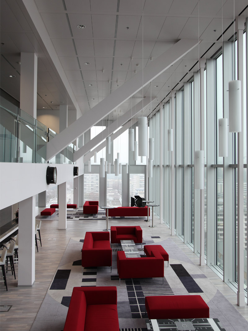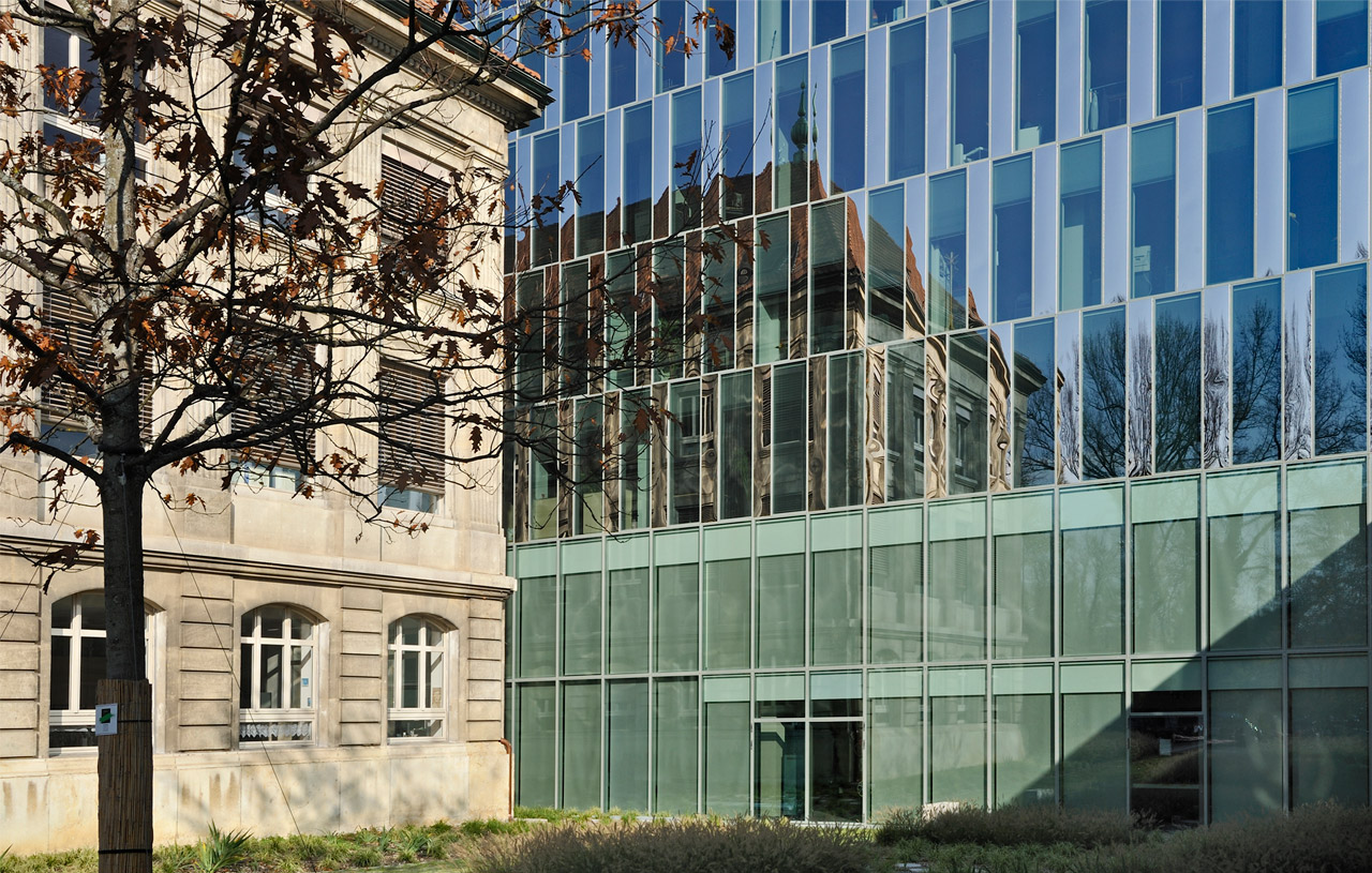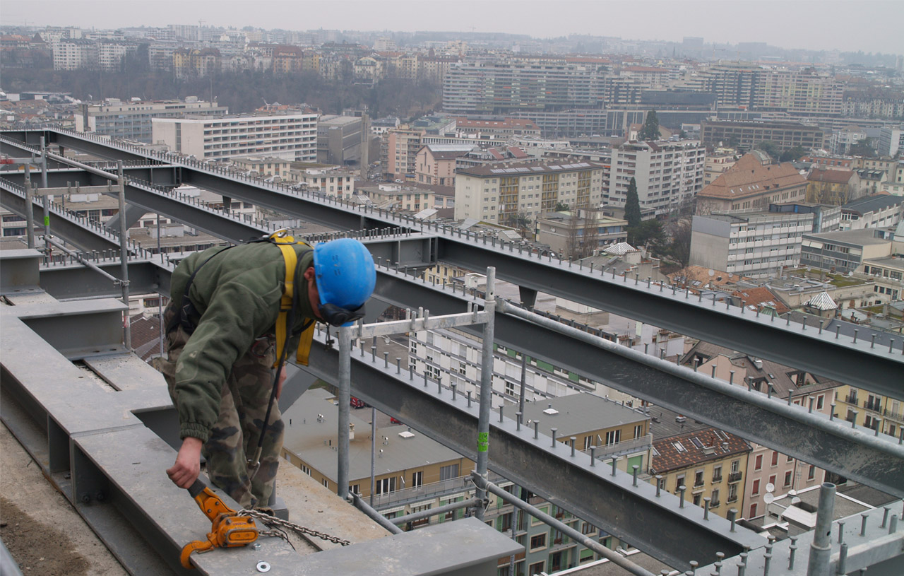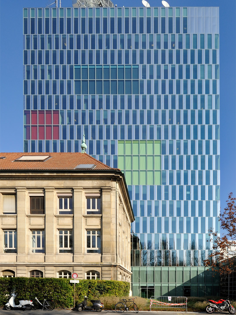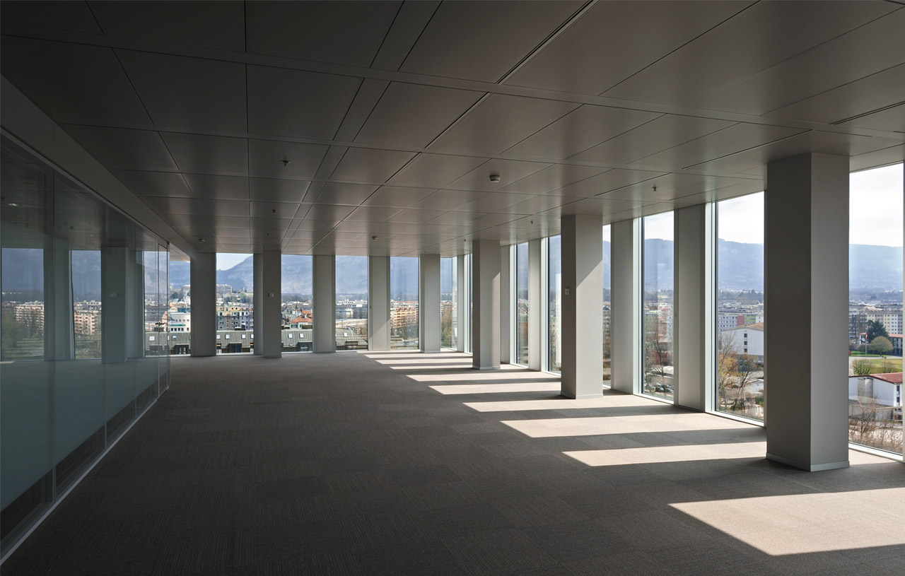 L’ancienne tour érigée par Arthur Bugna en 1973 était frappée d’obsolescence. Le projet pour la nouvelle tour a consisté en une mise à nu de l’ossature béton et à une redéfinition complète de son architecture. Il s’est agi de concevoir une organisation spatiale et une image contemporaine qui répondent au changement de culture de l’entreprise de service public qu’est la Radio Télévision Suisse (RTS). Les aménagements des espaces de travail des 800 collaborateurs sont réorganisés sur de larges plateaux parfois ouverts sur des espaces sur double ou triple hauteur. Ces atriums permettent la rencontre informelle d’équipes tout comme l’enregistrement d’émissions. Ouverts sur l’Arve et le quartier des Vernets, ils se transforment, le soir en vitrine d’une activité toujours palpitante et à l’écoute du monde. Du côté ville et paysage lémanique, c’est un espace en porte à faux, au sommet de la tour qui couronne l’édifice. Dévolu aux réunions plus importantes et parfois festives, la grande fenêtre qui le caractérise donne sur le panorama et le met en toile de fond des enregistrements d’interviews réalisés en prime time. Enfin, la façade est composée sur une trame de 155cm dont le rythme géométrique se joue d’une pixellisation et d’effets optiques particuliers. Le volume de la tour avec ses panneaux de verre et d’acier poli miroir reflète son environnement et le climat qui l’entoure, les nuages, la pluie, le bleu du ciel. Une image toujours changeante pour une tour emblématique dans le skyline genevois.