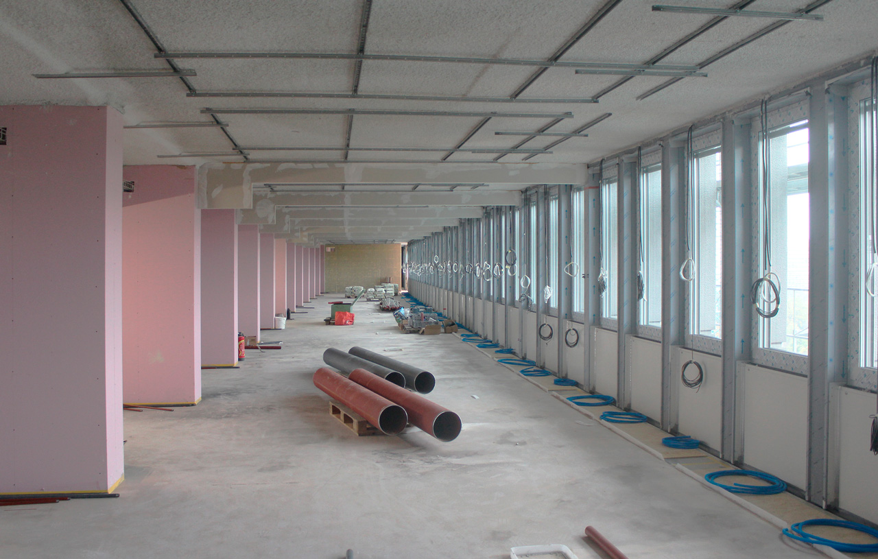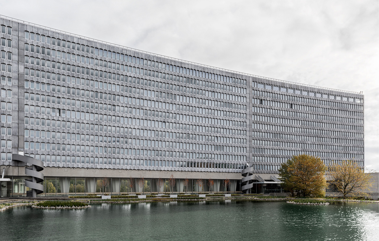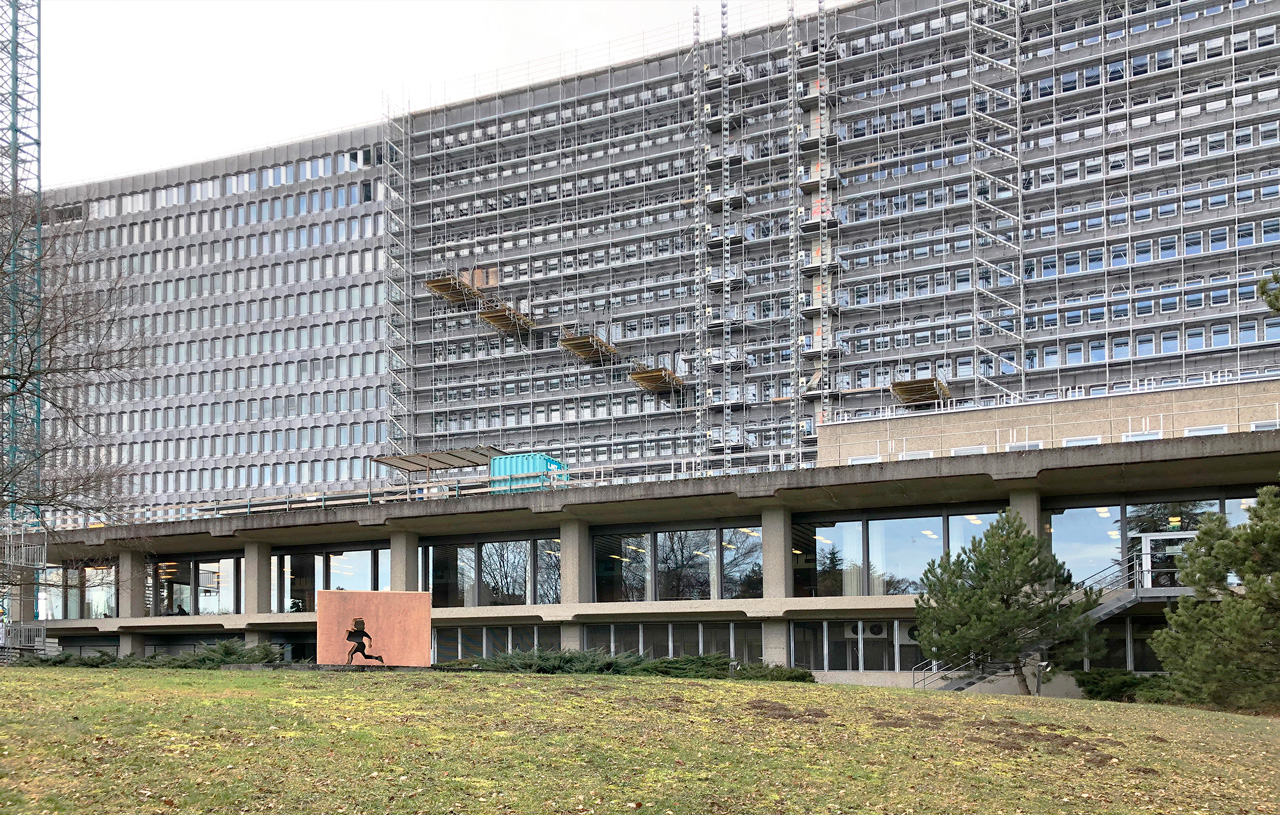 Le bâtiment, en forme de barre biconcave de 225 m de long et 40 m de haut contient les quelques 1250 bureaux du siège de l’organisation internationale du travail. Le chantier nécessite, non seulement une précision patrimoniale exemplaire, mais aussi une coordination complexe par phases, une grande partie du bâtiment restant en exploitation.