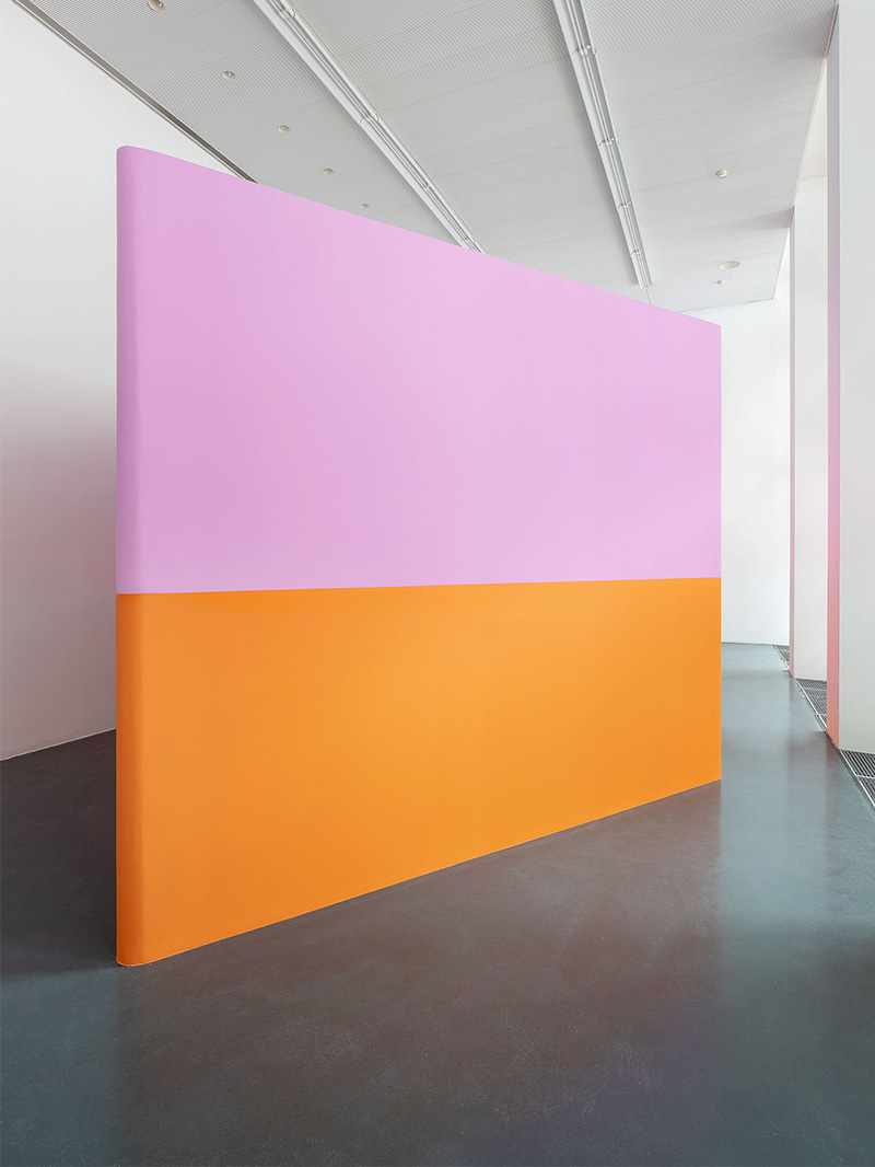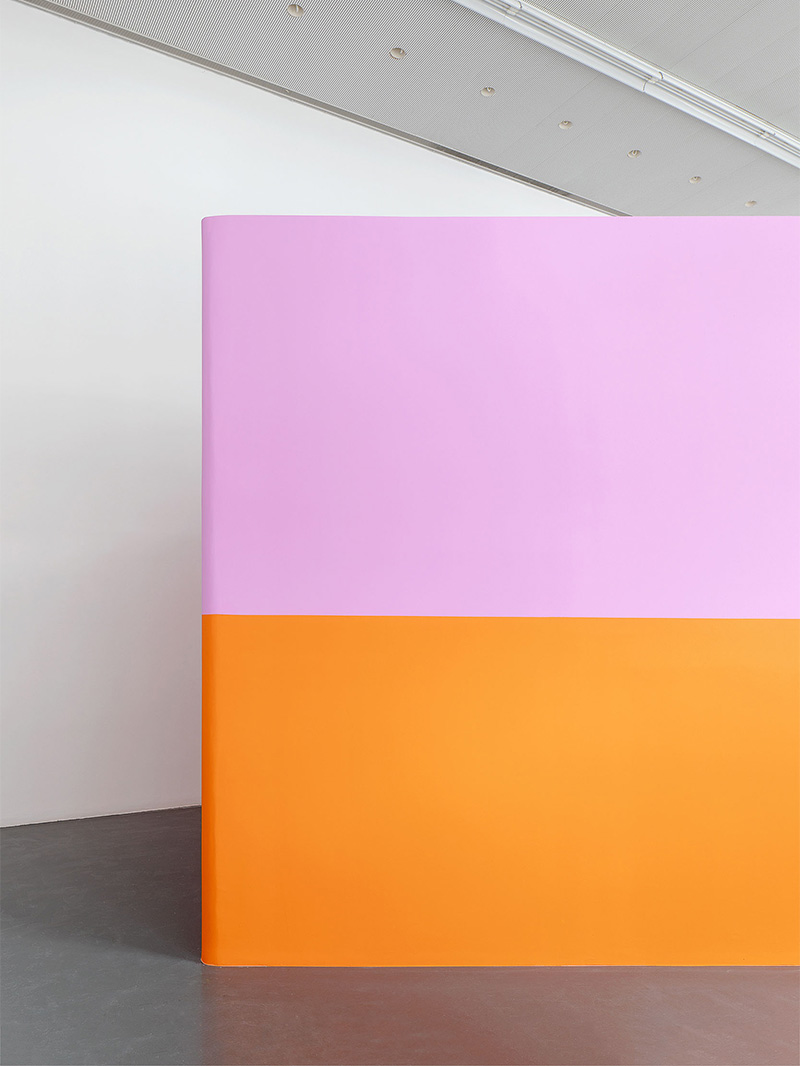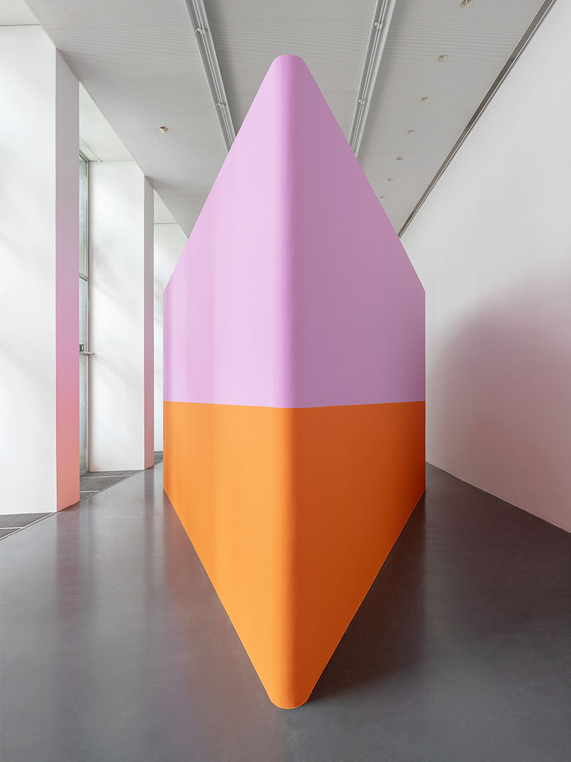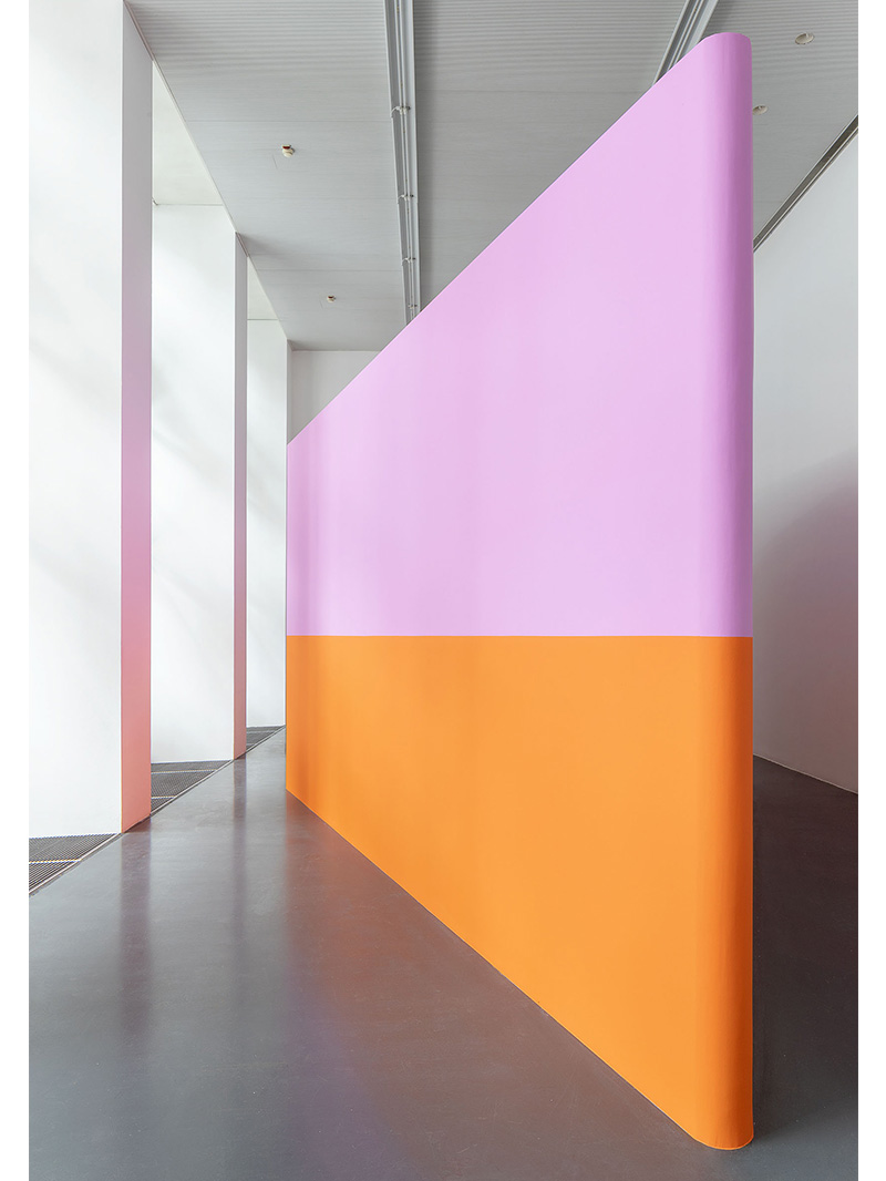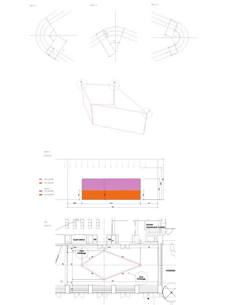 Troppo lungo, troppo alto, lo spazio esistente ha bisogno di qualche intervento. A questo punto Lamunière deciso di inserire nello spazio una grande struttura a forma di diamante. Costruita come un oggetto, non sarà mai percepita come tale. Le sue facce esterne però giocheranno con i muri esistenti. Dipinte di rosa e di arancio, danno forza e densità ad un nuovo e gioioso spazio in cui muoversi.